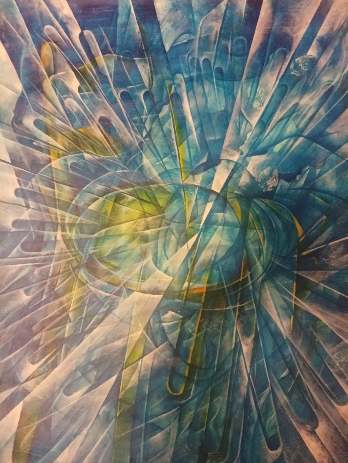 "Esplosione", Angelo Falmi, 100x70 cm, acrilico su tela, 2022; è la dinamica di una sedia blu, che invece di trovare il dialogo, l'incontro esplode nella ricerca di un nuovo racconto, e di un nuovo ascolto.