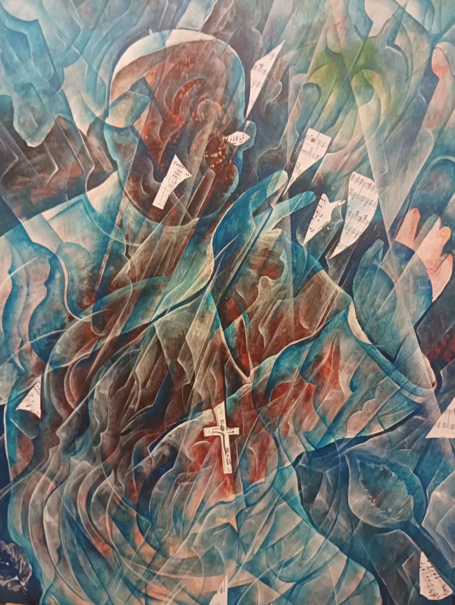 "Il Mistero Di G.P.II.", Angelo Falmi, 70x90 cm, acrilico su tela, 2023.; è il racconto di un mistero, della scomparsa improvvisa di un uomo che si trova seduto su una poltrona che scotta...lui è cielo ,forma dell' invisibile...mistero concreto del pensiero della creazione.