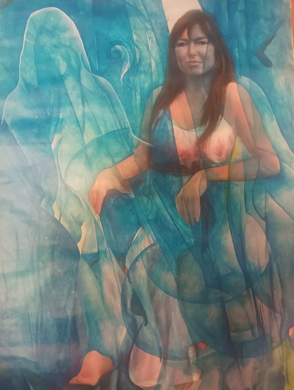 "Il Sogno Di L", Angelo Falmi, 100x90 cm, acrilico su tela, 2021; L. è una donna seduta che dalla sua poltrona guarda il futuro...non lo conosce lo aspetta nel riflesso di un ombra che le ricorda l'immagine del suo corpo.