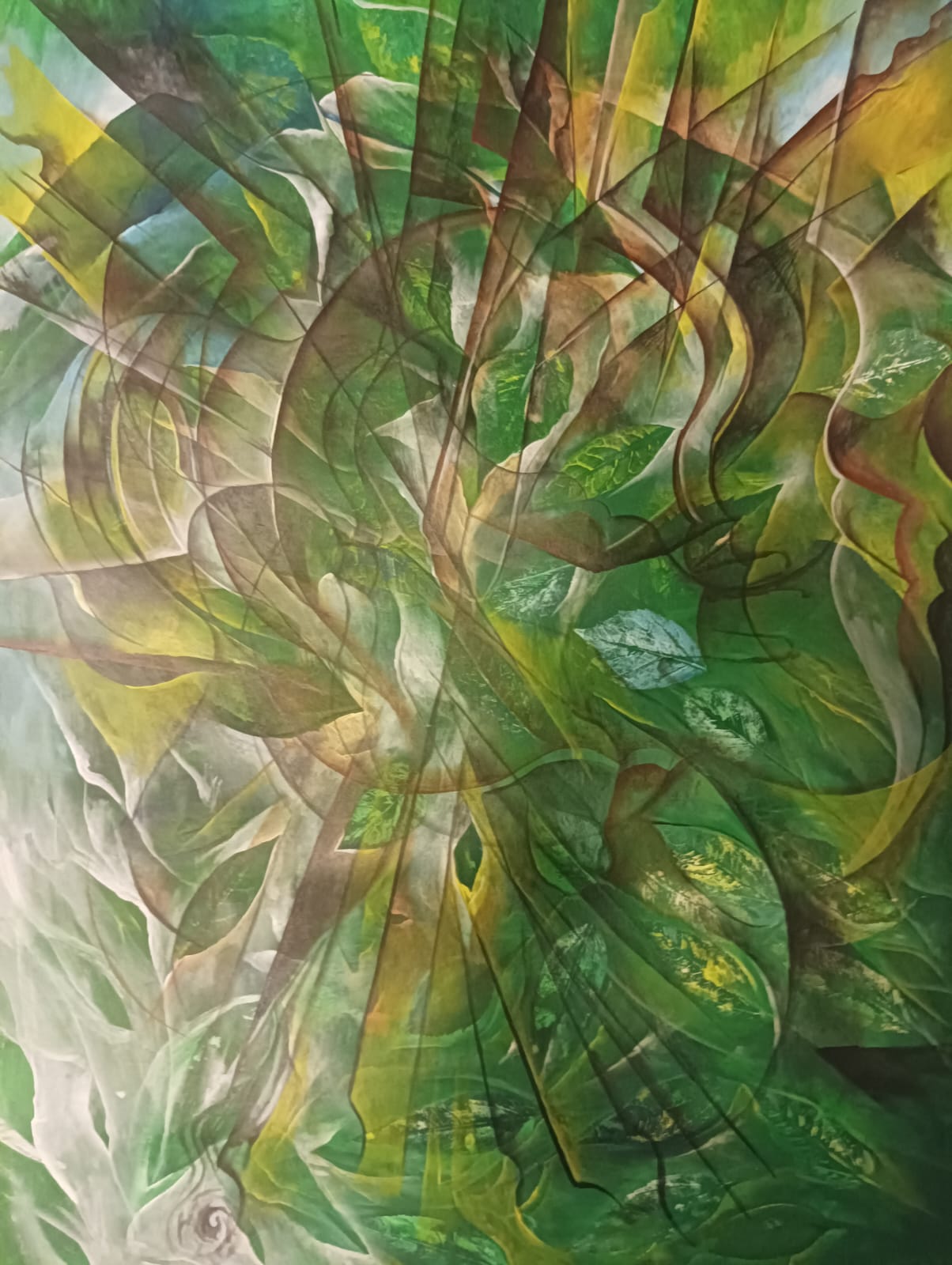 "La Natura", Angelo Falmi, 140x90 cm, acrilico su tela, 2022; il verde è incontro tra due colori ,tra freddo e caldo ricorda la primavera che danza a raggiera oltre i limiti del quadro cerca spazio , vuole correre verso nuovi orizzonti sconosciuti.