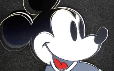 "Mickey Mouse", Andy Warhol, 96.5x96.5 cm, 1981; fa parte della serie "Myths"; realizza usando come soggetto personaggi di fantasia popolari della cultura moderna, al posto dei volti delle celebrità che era solito ritrarre.