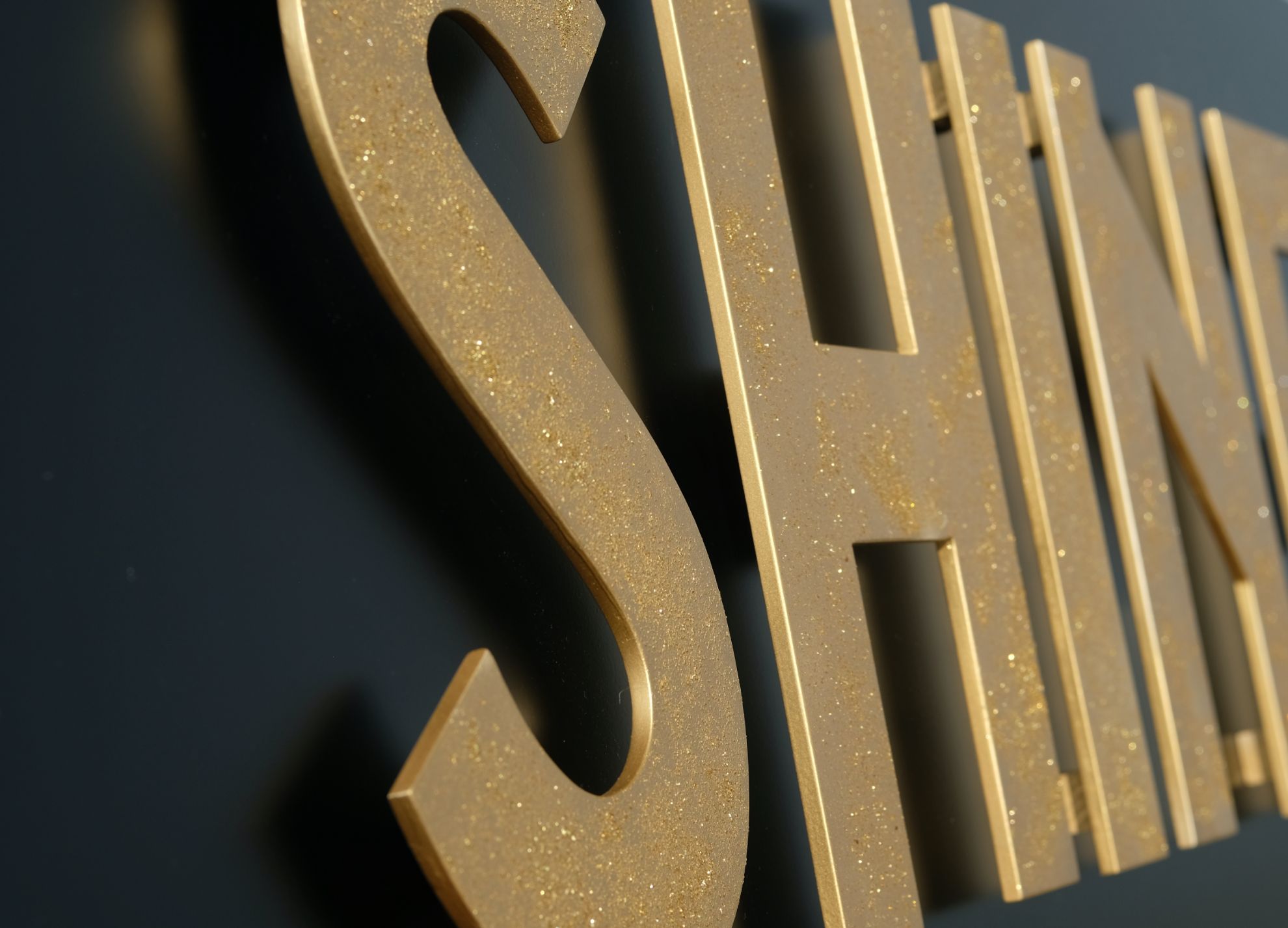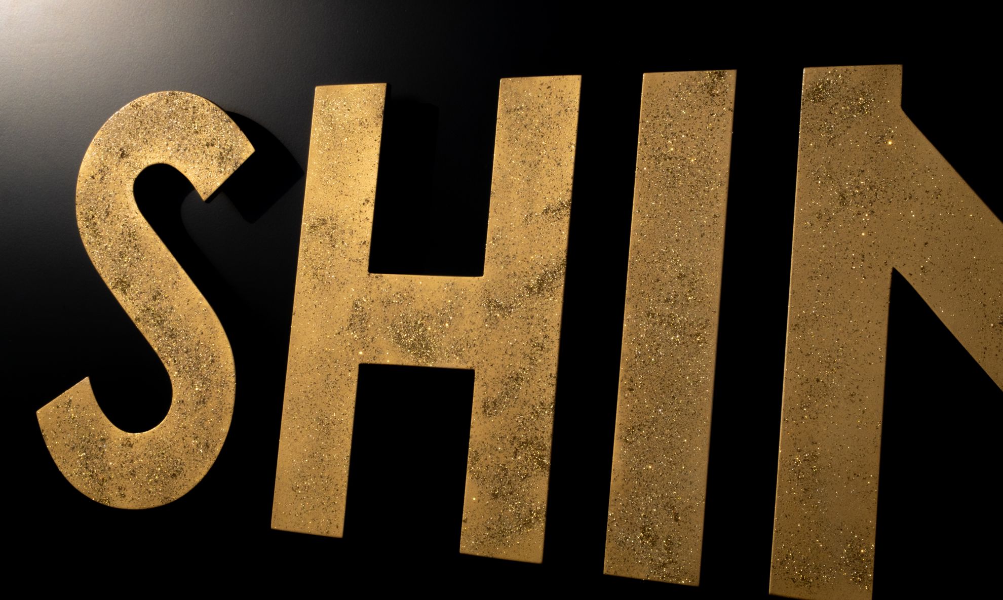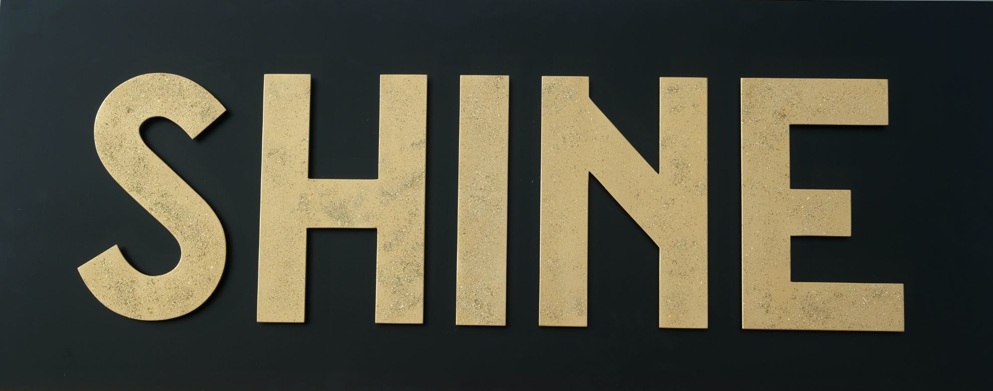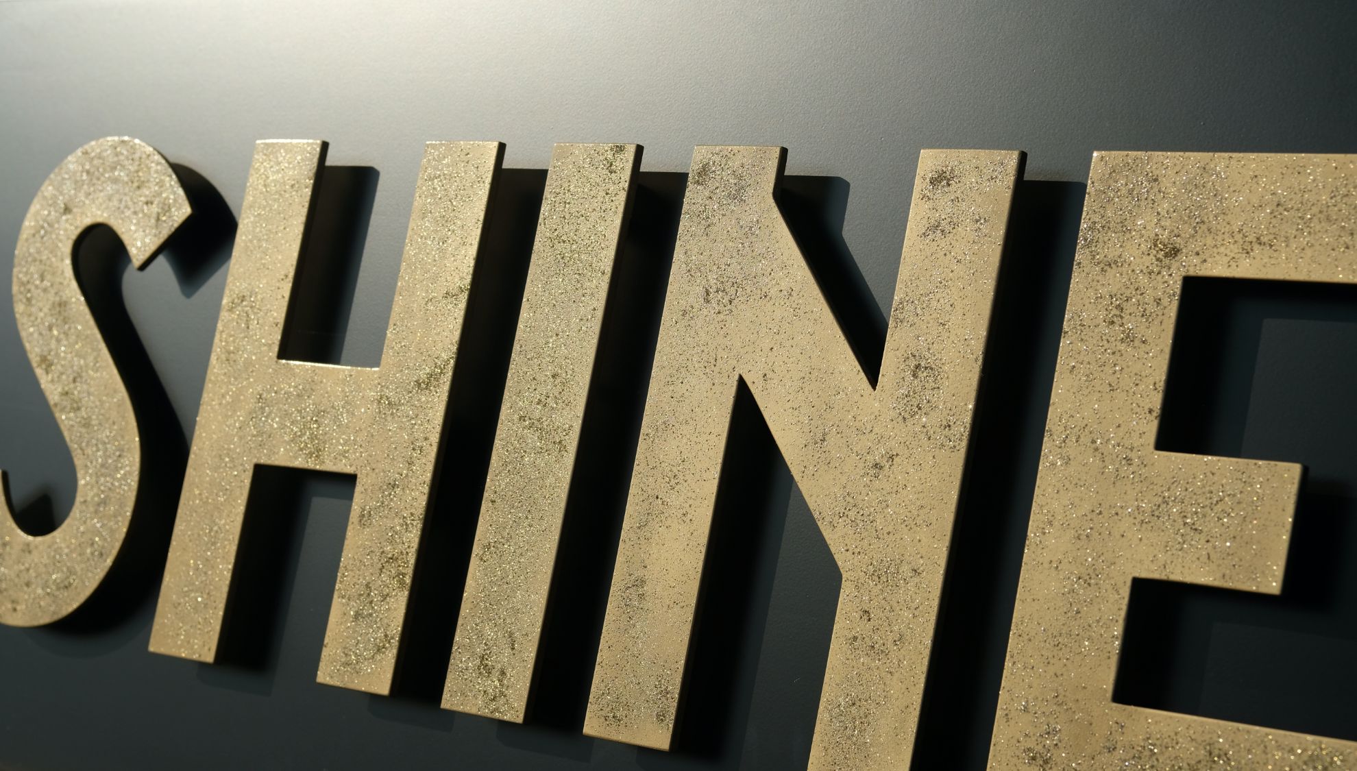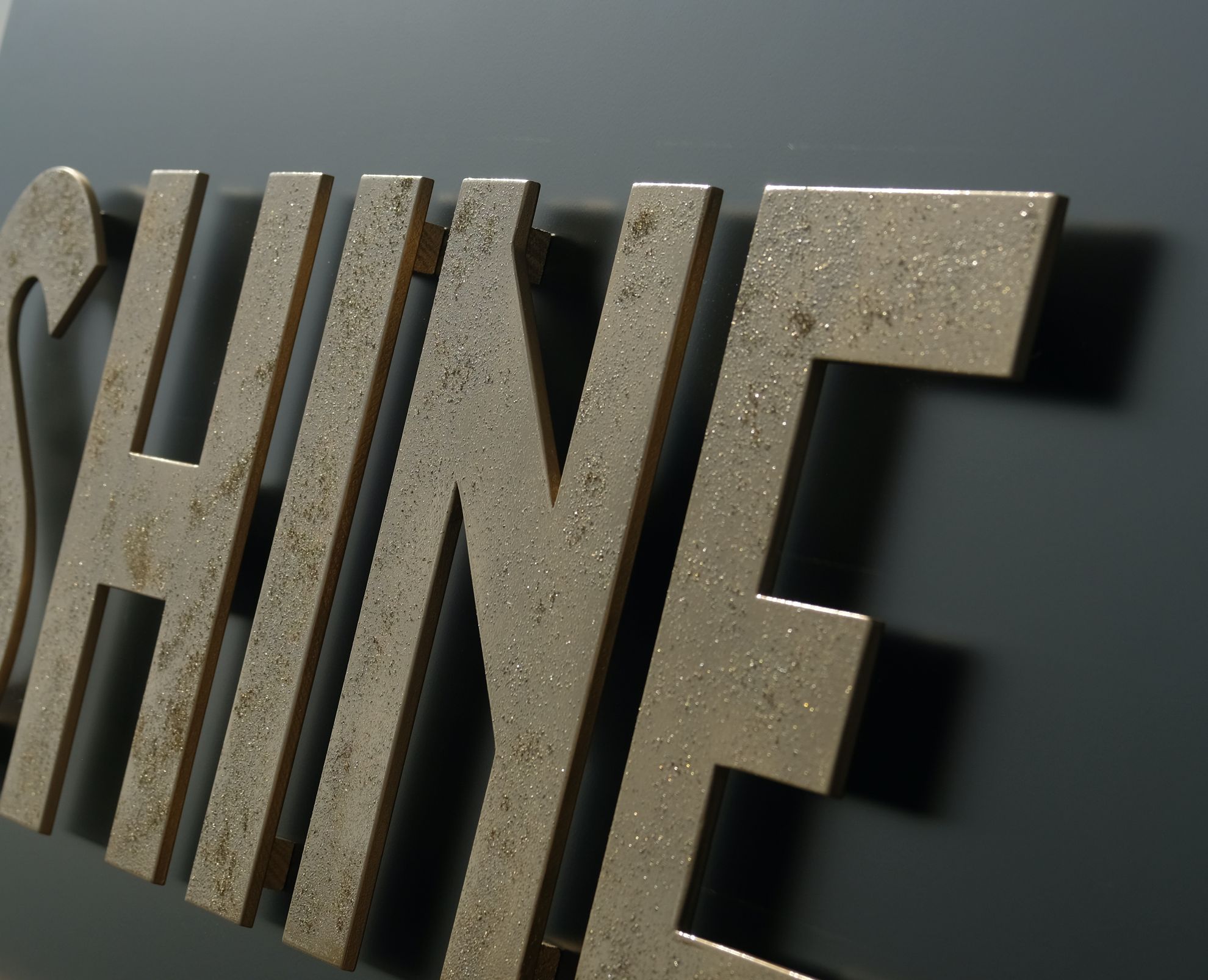 L’installazione “Shine” si compone di cinque lettere posizionate su un pannello in mdf verniciato di 50x122.5 cm