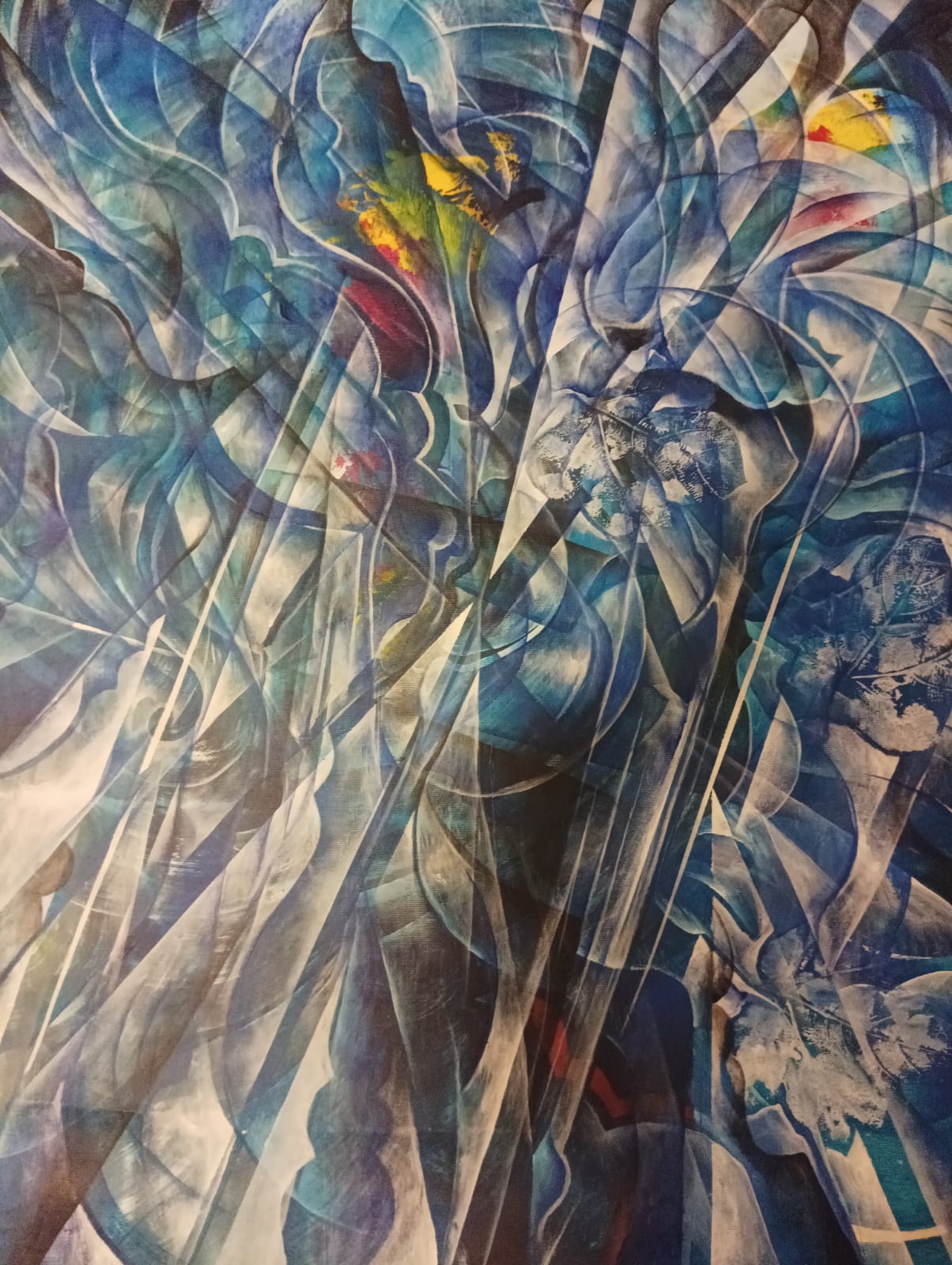 "Sinfonia In Blu", Angelo Falmi, 90x90 cm, acrilico su tela, 2022; il blu è il colore del cielo...del mare, dei lapislazzuli: pietra preziosa, unica, ricorda il vento e la musica del silenzio, sinfonia unica dell'incontro di note che formano accordi infiniti.